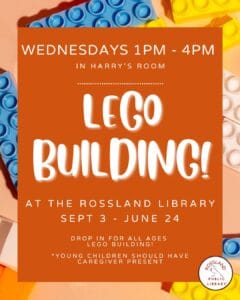 Drop in for some creative fun! Join us in Harry’s Room every Wednesday from 1–4pm at the Rossland Library, September 3, 2025 – June 24, 2026