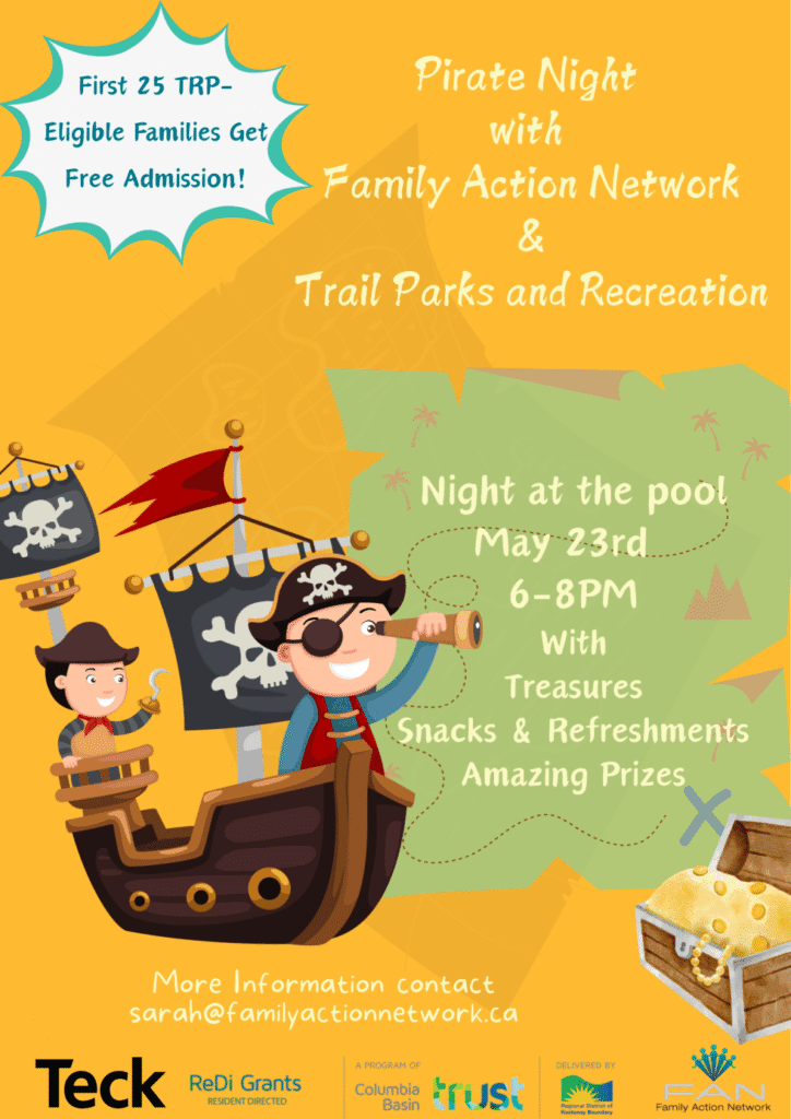 The Family Action Network is teaming up with Trail Parks and Recreation to bring you an exciting Pirate Night at the Pool on May 23rd from 6–8PM! πŸ΄β€β˜ οΈ